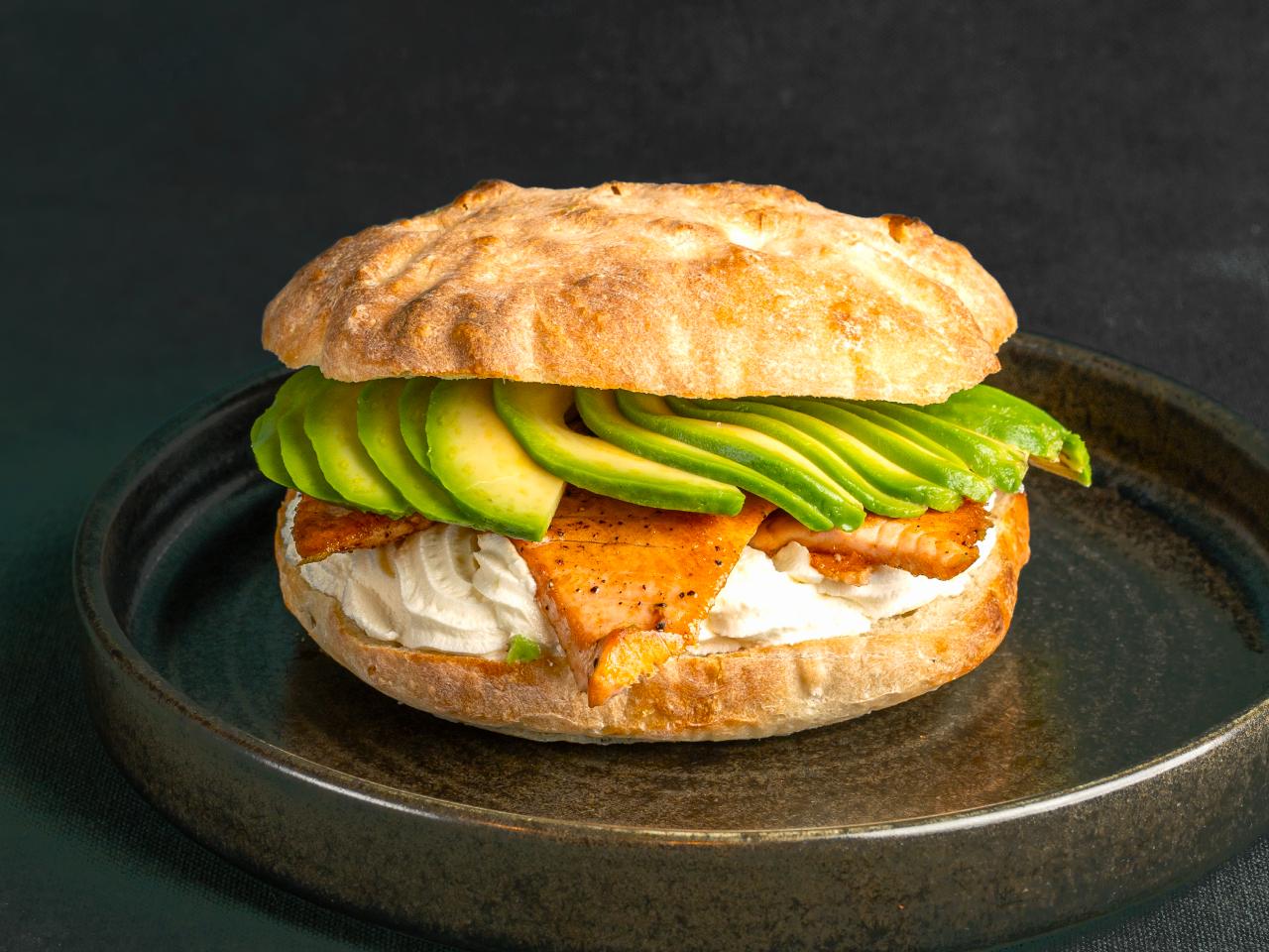 Sandwich cu aluat facut in casa, de bucatarii proprii, precum si cu somon gatit pe tepan, avocado, crema de branza si maioneza;